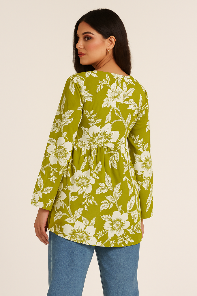 Fresh and effortless, this green floral printed top features a flattering V-neck and full sleeves. Made for everyday comfort, it pairs perfectly with jeans or trousers for a clean, casual look—ideal for work, outings, or daily wear.